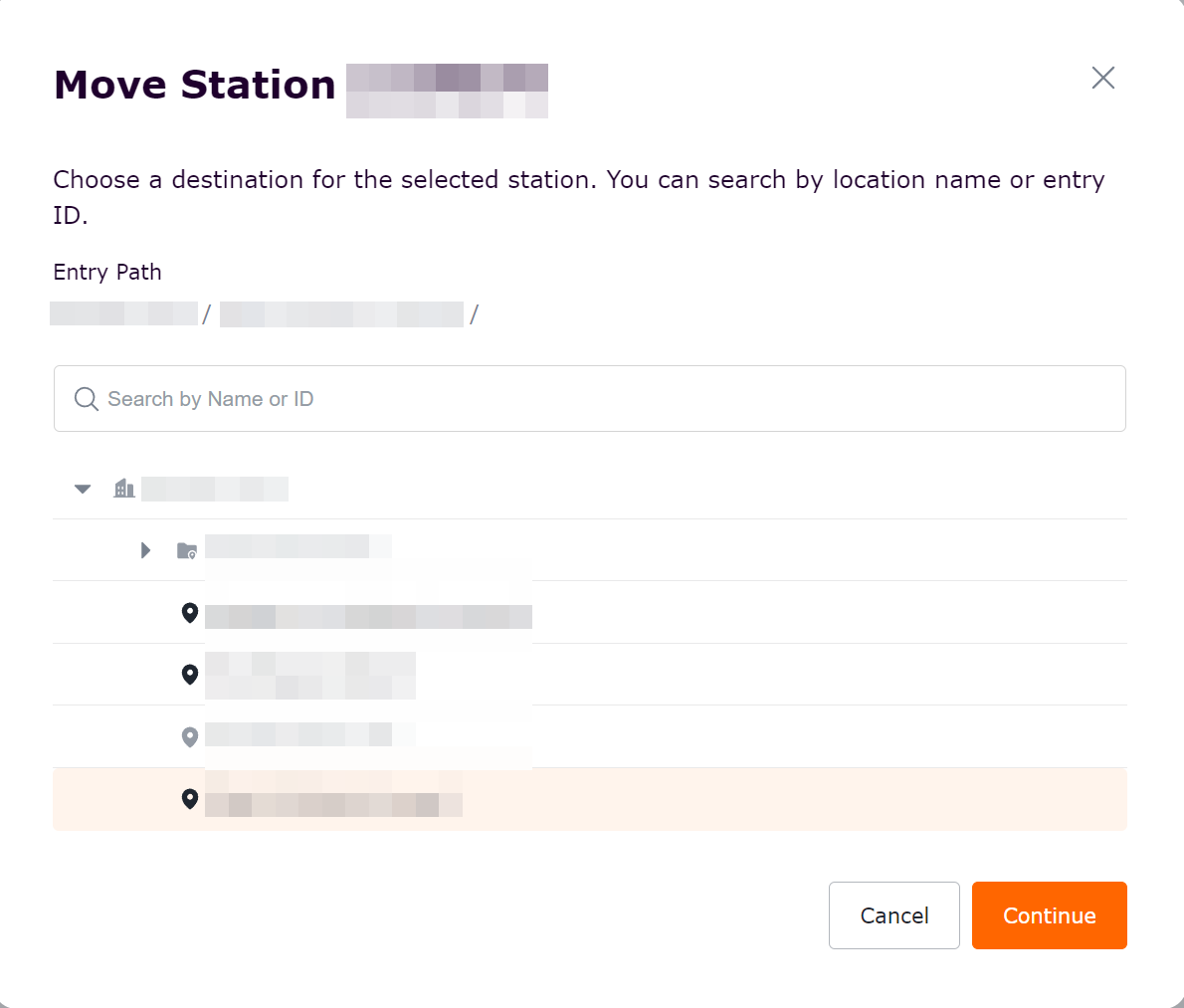 Once confirmed, you will be presented with your site directory where you can select the site you would like to relocate your station to. You can also expand, collapse, or directly search through sites and groups at this step. You can continue after selecting your site.