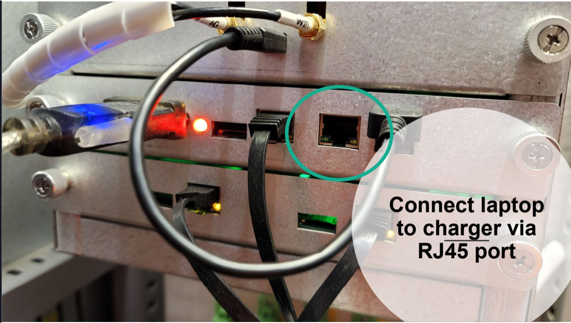 Connect the RJ45 cable to the station. Connect the RJ45 cable to the laptop.