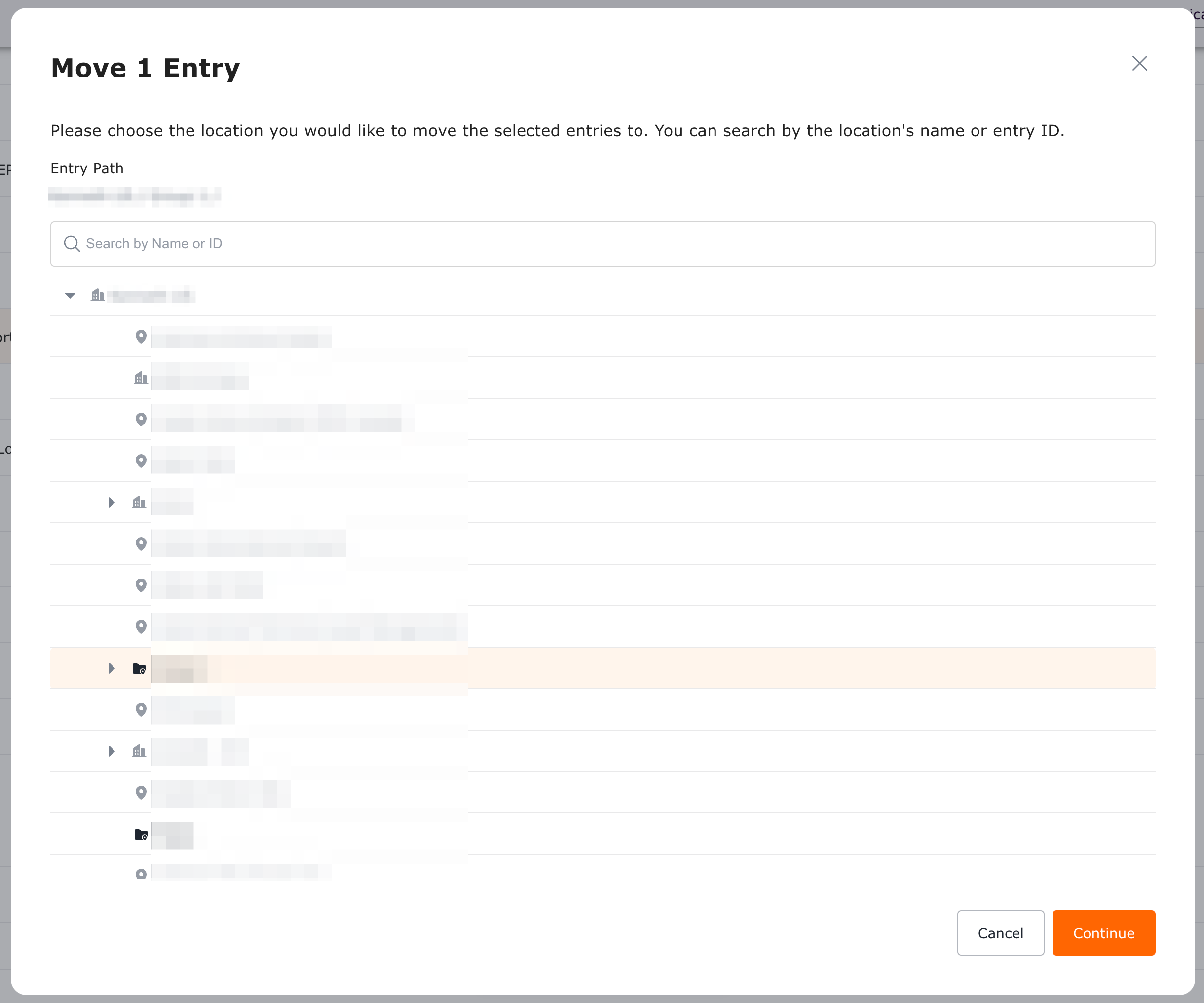 3. Click the Move button. In the pop-up dialog, navigate the directory tree to select the new parent entry or destination folder. Once selected, click Continue.