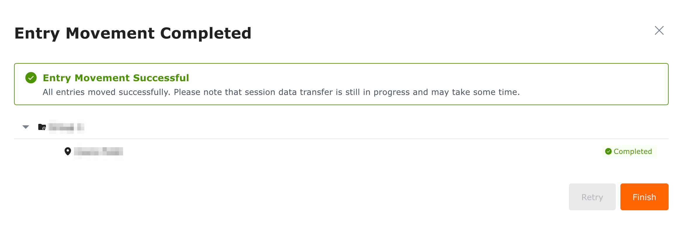 4. The system will begin reassigning the site to the new location. Once the progress is complete, click Finish to refresh the directory and confirm the move.