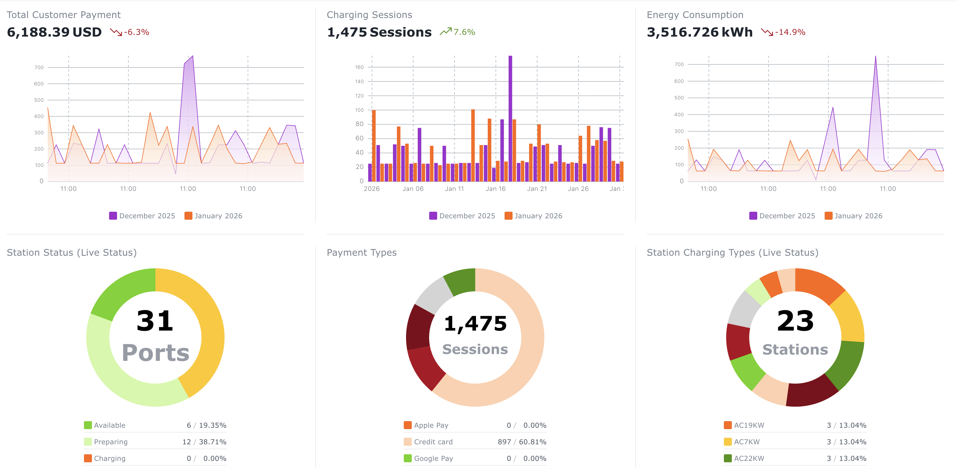 The Dashboard provides a high-level overview of your charging network’s performance. Use these key metrics to monitor usage trends, equipment health, and driver payments at a glance.